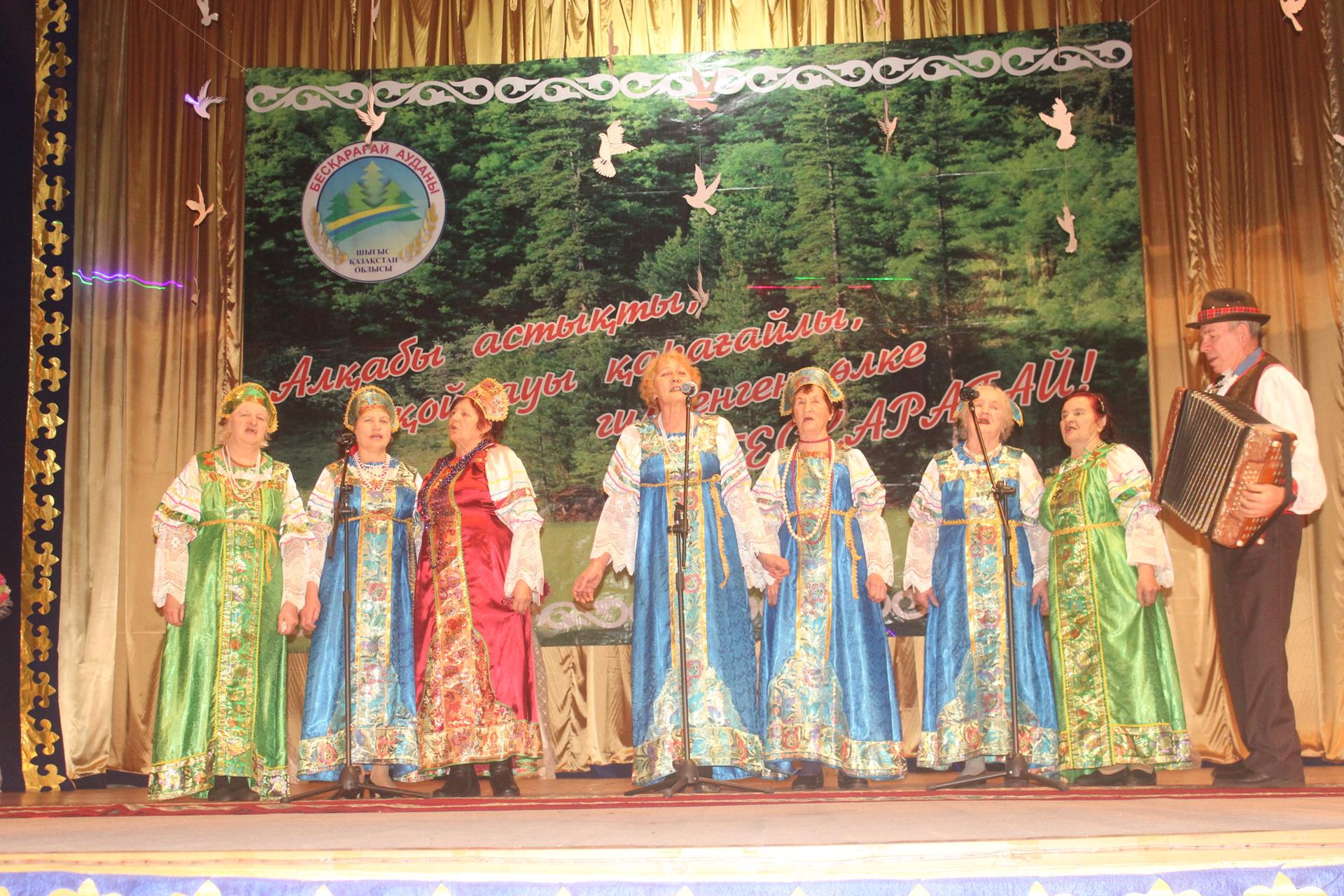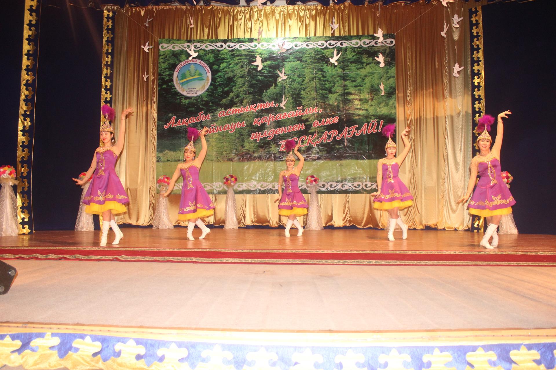 Началось мероприятие массовой композицией «Под единым шаныраком» с участием всех членов этнокультурных объединений района, артистов Дома культуры, учащихся Бескарагайского колледжа и воспитанников детского сада «Айналайын».